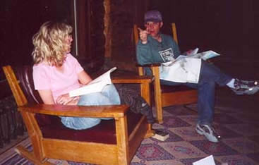 Last night I lay claim to mission rockers in a corner of the Inn lobby and began my long-awaited journey with Stephen Ambrose and his “Undaunted Courage” account of Lewis and Clark. It seemed appropriate for this place. Tonight, Jim and Annie play “Palace” on an antique illuminated card table on the second floor balcony while I sink into a cushy armchair on the main level. The chair doesn’t rock but makes up for it geographically: I can see just about everything. The scale, extravagance, and bustle of this log cabin interior demand my full attention. Surely, my book will keep a while.