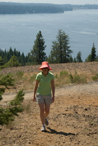 We don’t know enough about bronze to fully appreciate it, but the true surprise and masterpiece, Wallowa Lake, awaited us down the highway.  We saw rustic cabins (where you can pick whatever you want), horseback rides, bumper cars, paddle and motor boats, fishing holes, swimming areas, ice cream stands, and undomesticated kids and deer.  We took a 15-minute tram ride to the top of a mountain with painless hiking trails and staggering views.  I posed on rocky cliffs near hang-glider departure points and tried to mask the look of terror in my eyes while Jim clicked away.  The modest wonderland of the Joseph area reminded me of the McCall of my childhood.